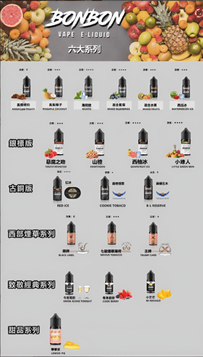BONBON邦邦小煙油系列以高品質美國進口原料製作,搭配實用的30ml容量與30mg尼古丁濃度,滿足不同使用者的需求。這款煙油系列擁有超過二十款風味選擇,從清新的水果口味到冰感薄荷與醇厚菸草,應有盡有,讓每一位玩家都能找到適合自己的風味。